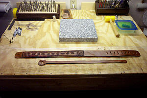 | The strap is then dampened with a casing solution, placed in an air tight bag and allowed to cure. | Once cased, the strap is ready to begin laying out the desired design for carving and tooling. | Carving and tooling is continued until all designs, lettering and borders are completed. | The "tail" or adjustment strap is traced, cut and edged in the same manner as the strap. |