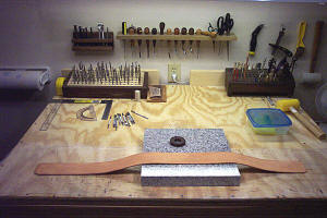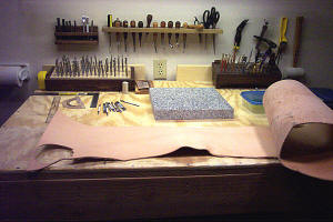 | It all starts swith a big piece of cow hide! We use only the highest quality Veg-Tanned double shoulders. | A strip is then cut to the specified width of the strap. | The desired pattern is traced and cut. Adjustment slots and attachment holes are punched. | The edges are finished by beveling, applying a treatment and then burnishing. |