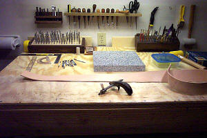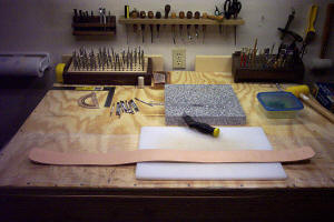 | The strap is then dampened with a casing solution, placed in an air tight bag and allowed to cure. | Once cased, the strap is ready to begin laying out the desired design for carving and tooling. | Carving and tooling is continued until all designs, lettering and borders are completed. | The "tail" or adjustment strap is traced, cut and edged in the same manner as the strap. |